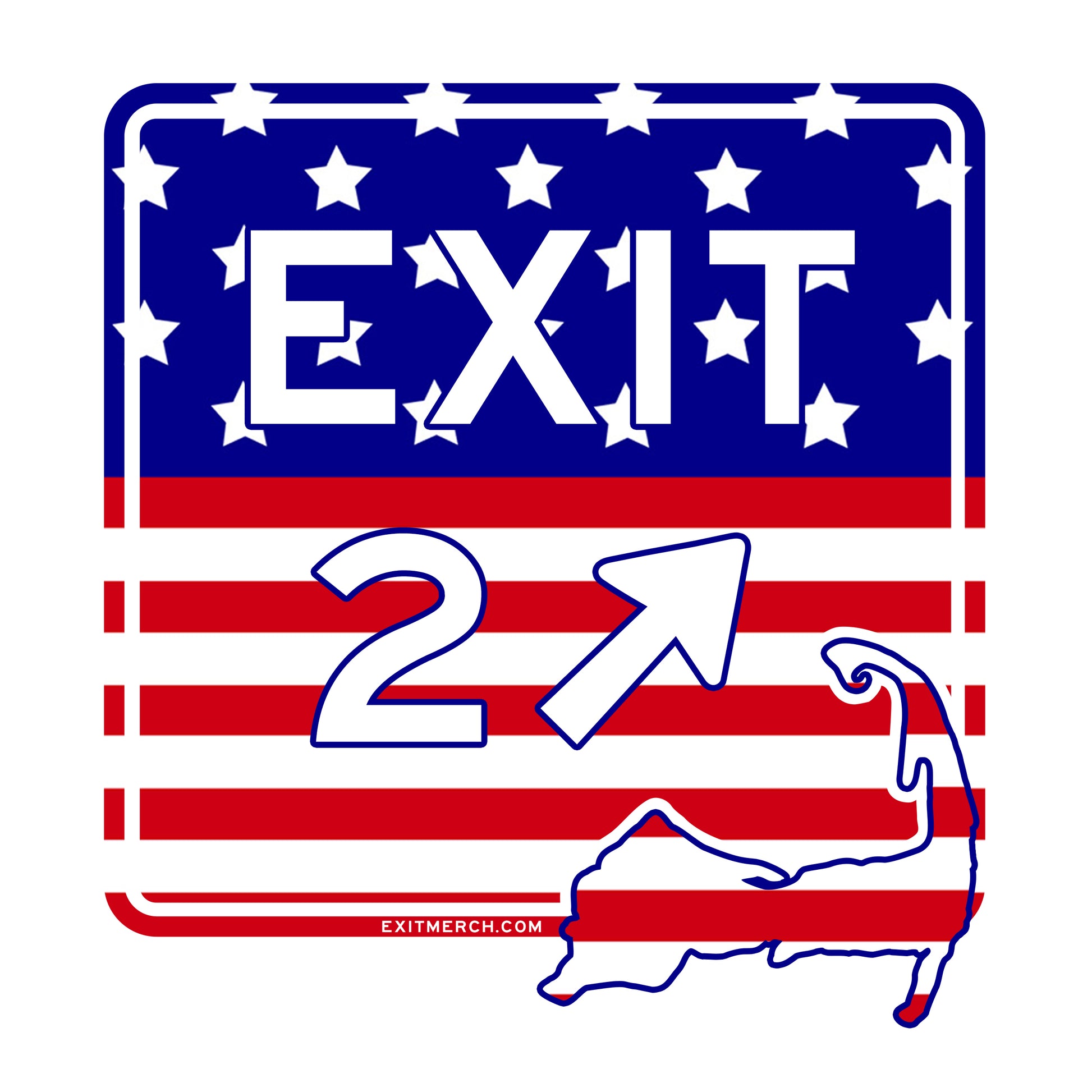 4" x 4" die-cut vinyl Cape Cod Exit 2 sticker with American Flag background. Great for your laptop, skateboard, bike, kids’ lunch boxes, mugs, notebooks, car and more! #REPYOUREXIT #WHEREDOYOUGETOFF #MERICA