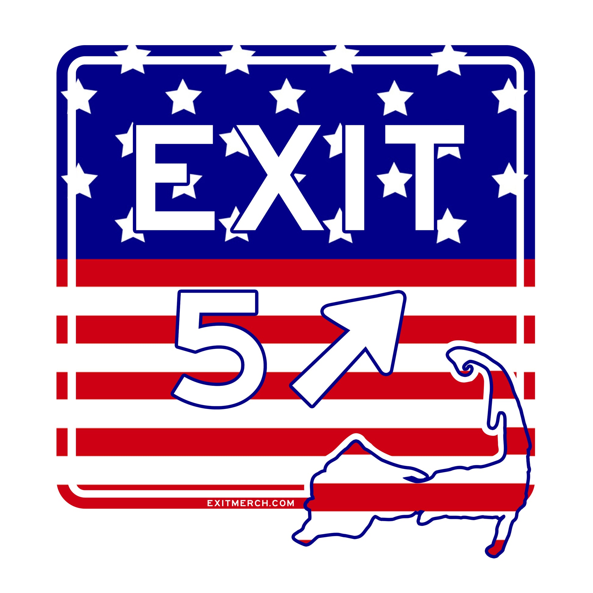 4" x 4" die-cut vinyl Cape Cod Exit 5 sticker with American Flag background. Great for your laptop, skateboard, bike, kids’ lunch boxes, mugs, notebooks, car and more! #REPYOUREXIT #WHEREDOYOUGETOFF #MERICA