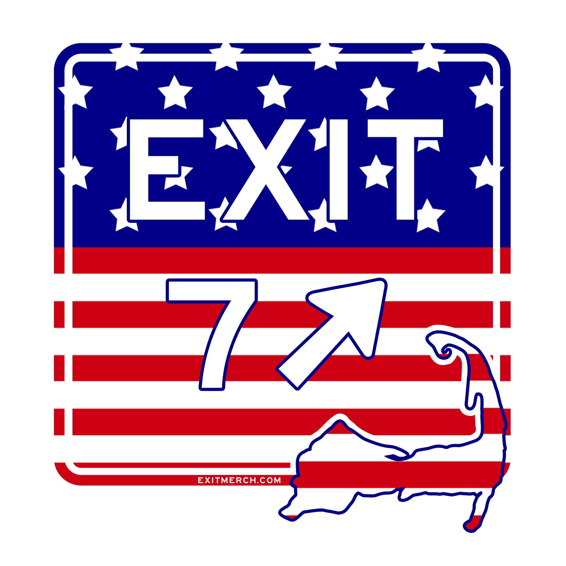 4" x 4" die-cut vinyl Cape Cod Exit 7 sticker with American Flag background. Great for your laptop, skateboard, bike, kids’ lunch boxes, mugs, notebooks, car and more! #REPYOUREXIT #WHEREDOYOUGETOFF #MERICA
