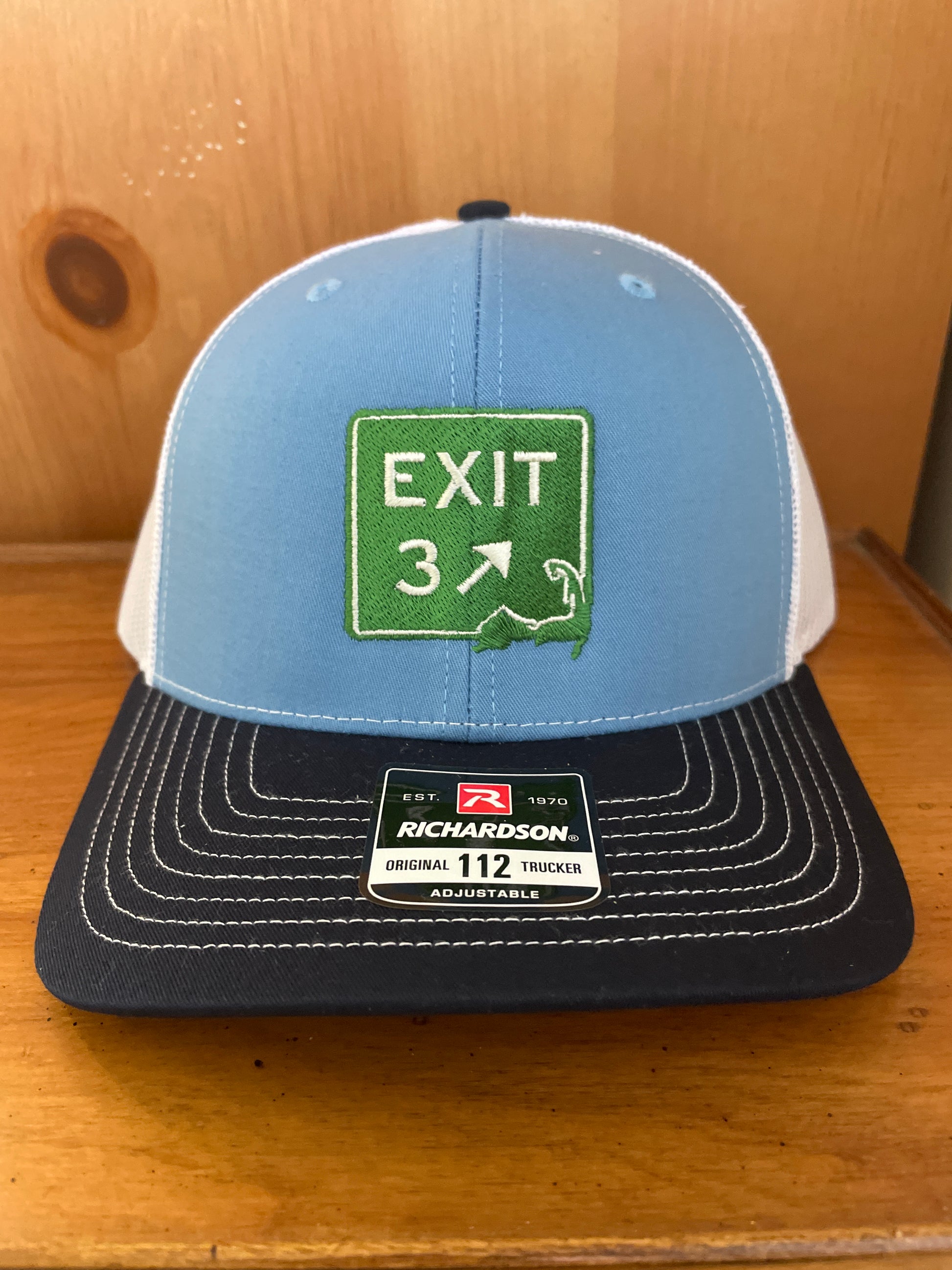 EXITMERCH's Richardson 112 Exit 3 trucker hat with our custom Cape Exit logo. This classic trucker cap style is built with the Richardson quality and fit you’ve come to expect. EXITMERCH then combines it with the exit you love! A perfect match in our opinion. Choose from a variety of colors: Grey/White, Navy/White and Columbia Blue/Khaki and Sandwich HS Tri-Color: Columbia Blue/Navy/White. #REPYOUREXIT #WHEREDOYOUGETOFF #sandwich #mashpee