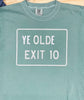 Off-white distressed Old Exit 10 graphic with a clean bright-white "Ye" and "e" added over a Light Green Comfort Colors men's t-shirt. Big hit at the 4th of July parade!
